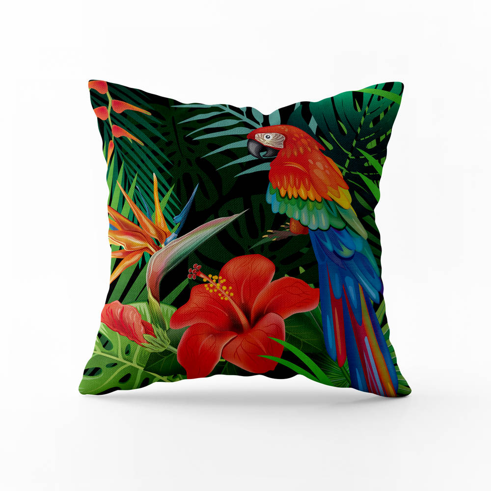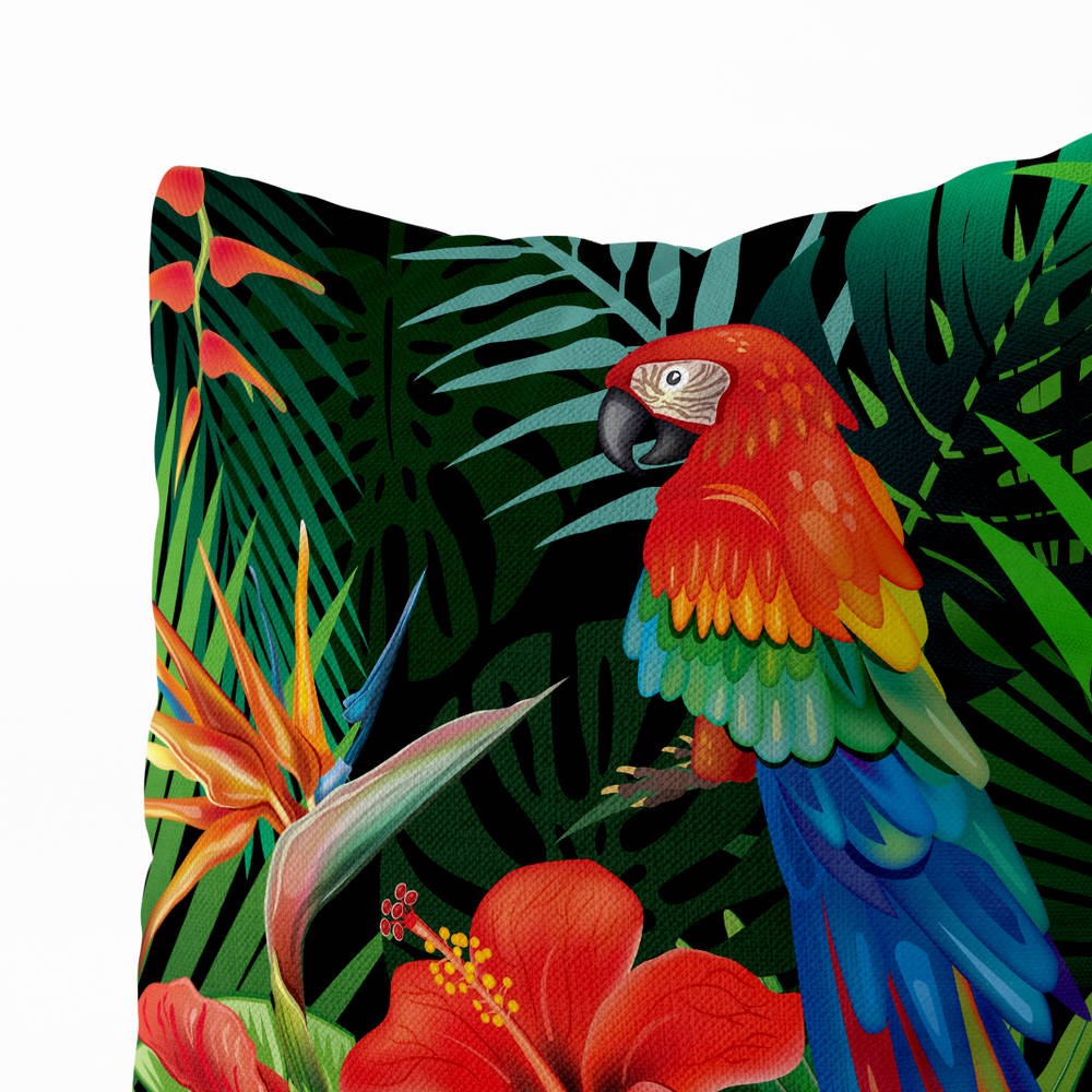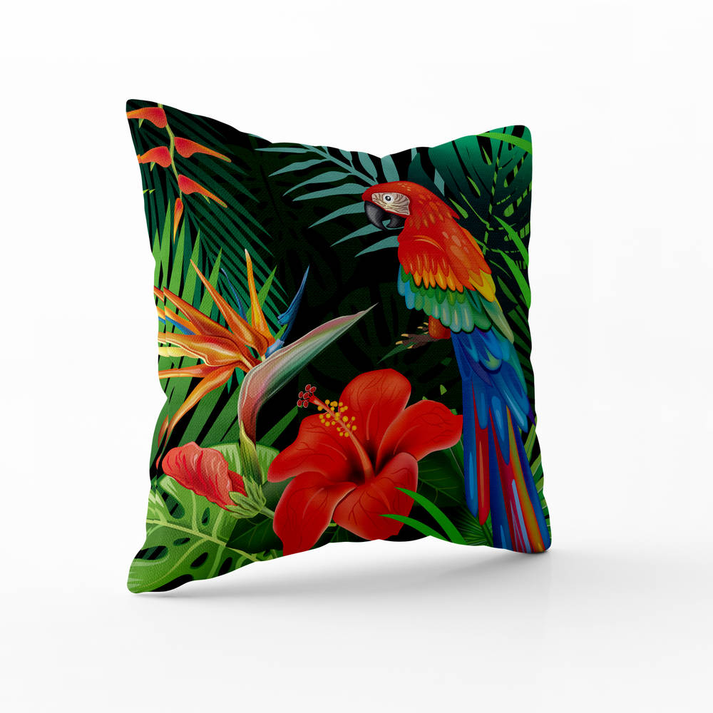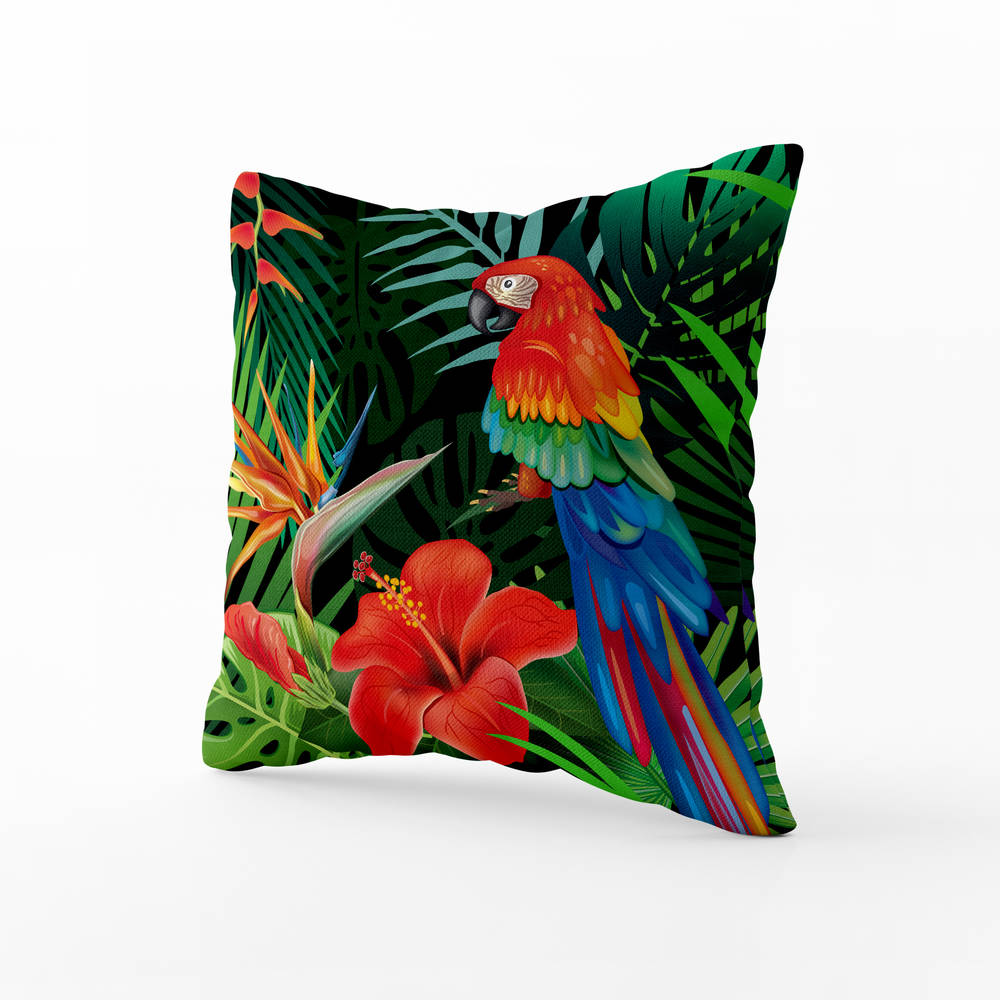 - Barevný papoušek na polštáři vnese do interiéru živost, tropické barvy a energii přírody.