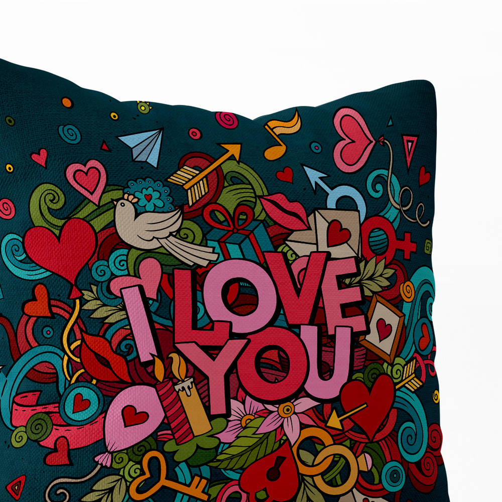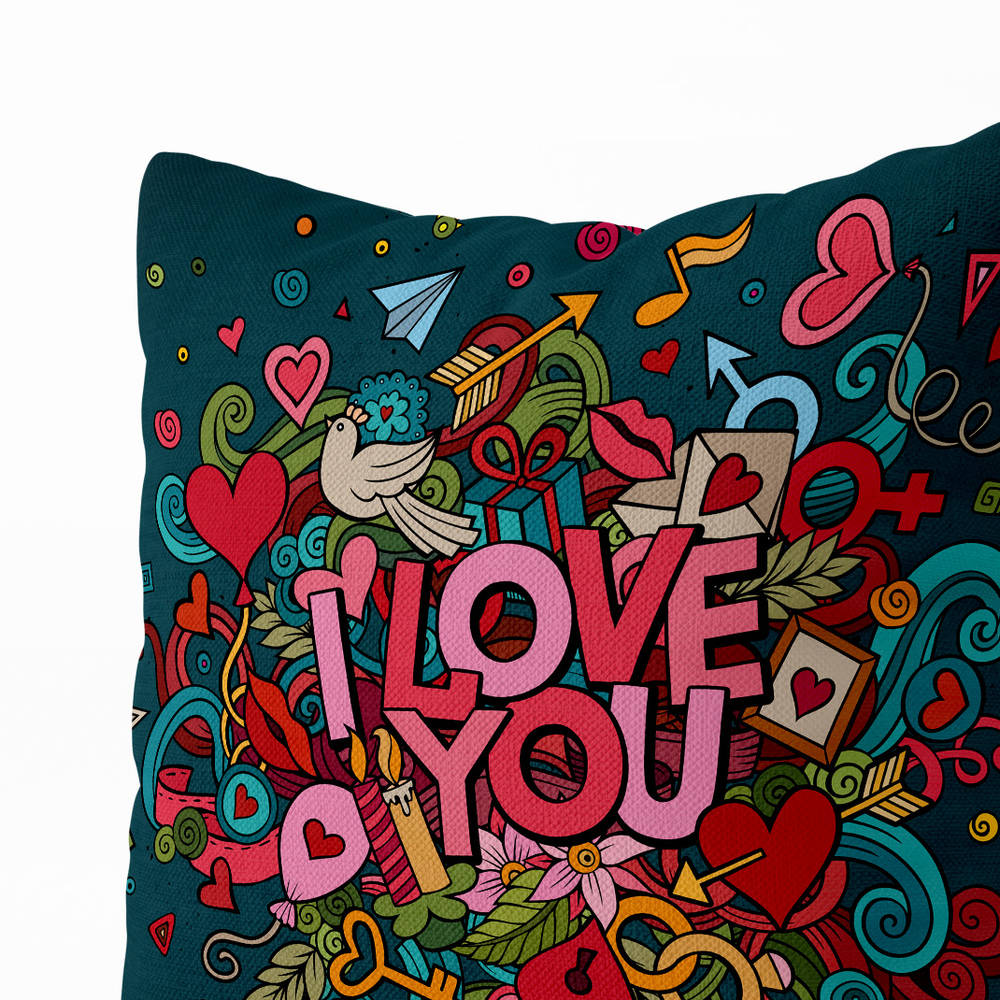 Láska, která rozzáří prostor. Růžový nápis I LOVE YOU na tyrkysovém pozadí s jemnými ornamenty vytváří hravý, optimistický kontrast a promění polštář v výrazný detail. Detaily: