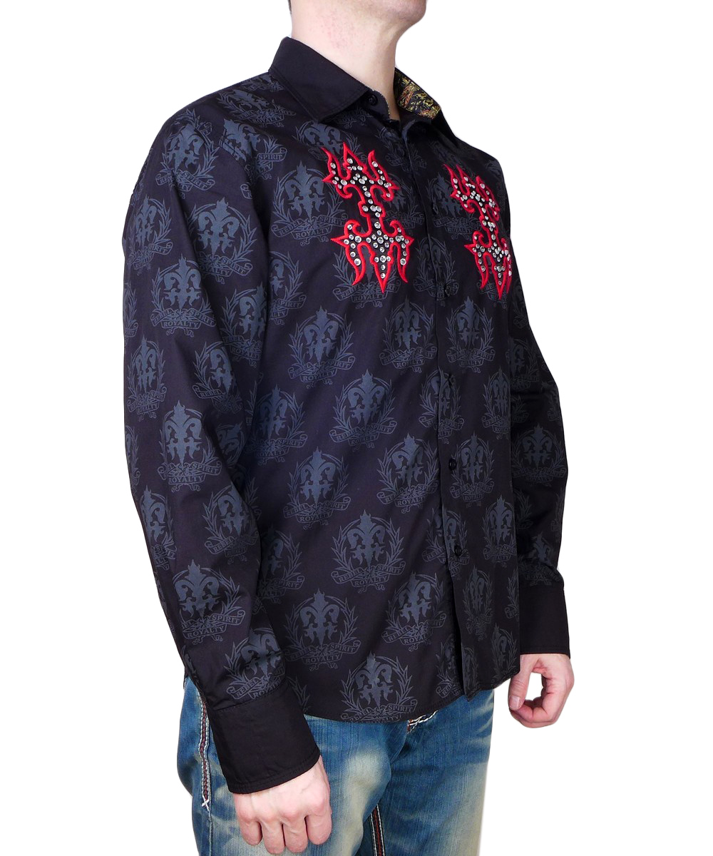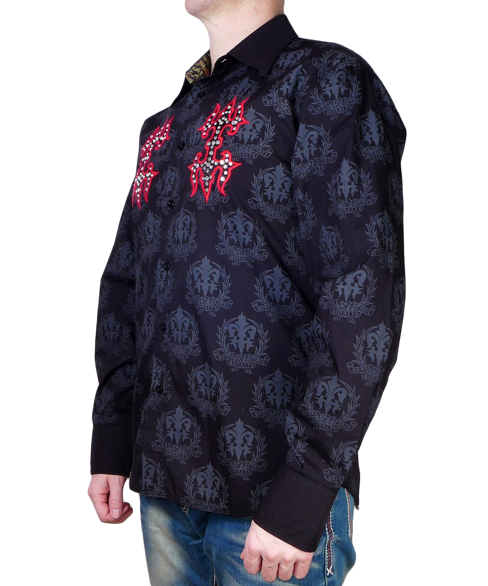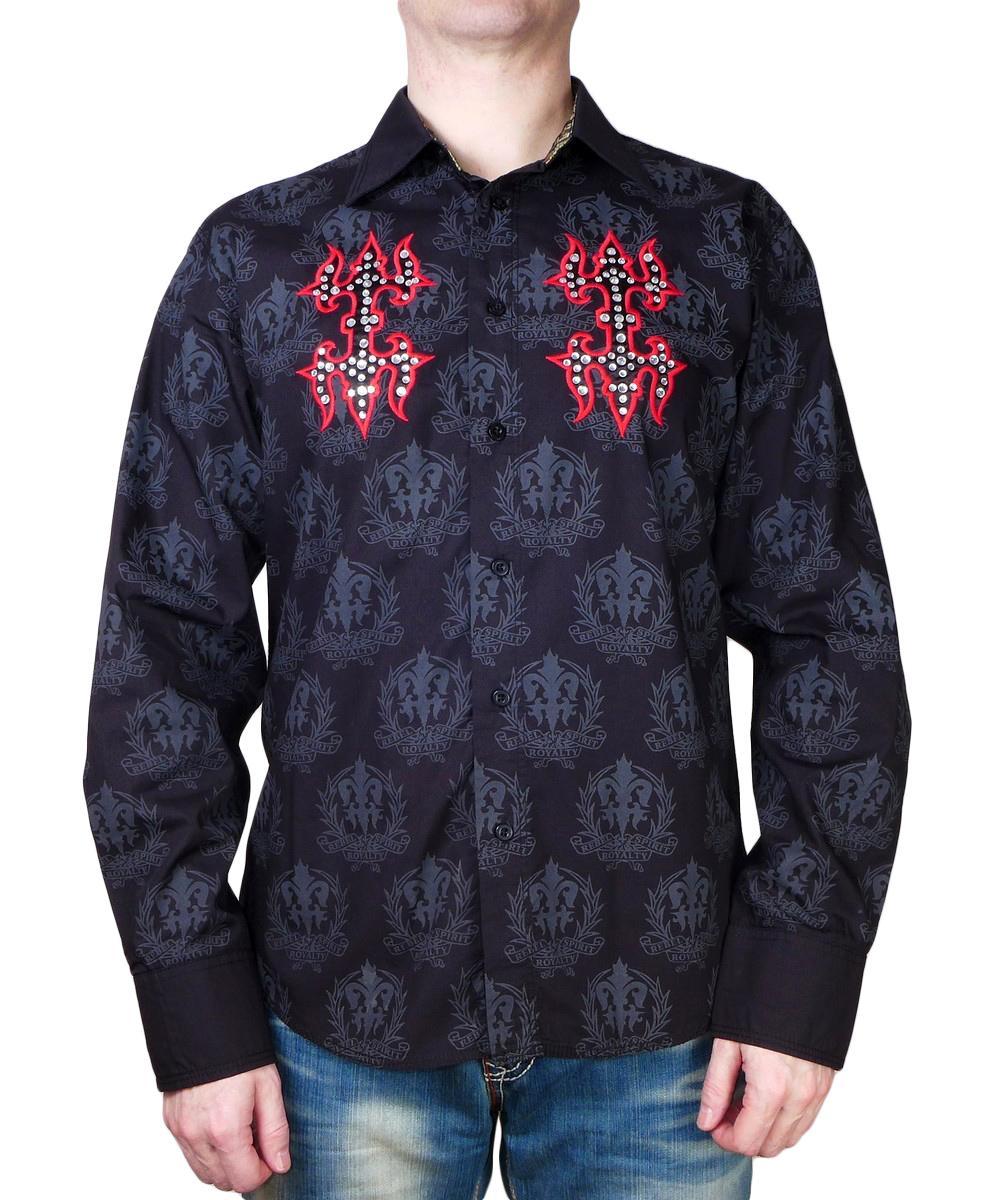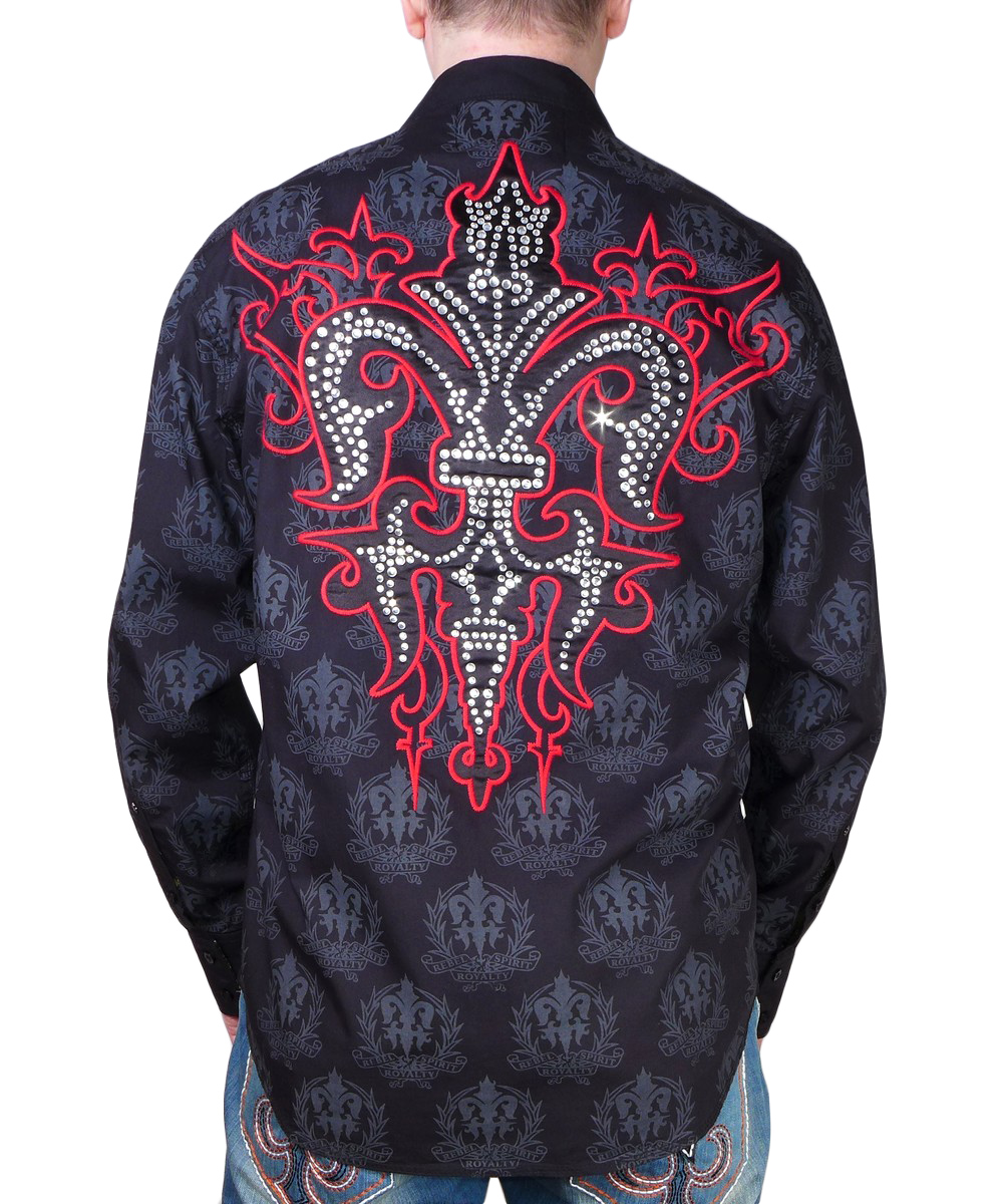 Pánská košile Rebel Spirit královský diamant (černá). Tip na luxusní dárek pro sebevědomého muže s královským stylem života. Na zádech je velký motiv výšivky v červené, rozšířen o náznaky plamenů, je vykládaný umělými diamanty. Autentický Rebel Spirit královský styl.
