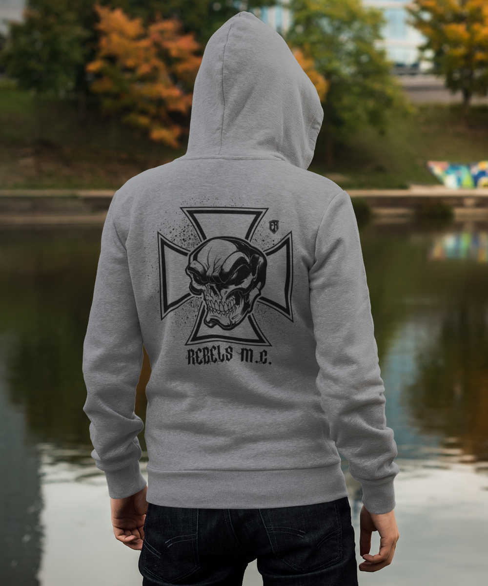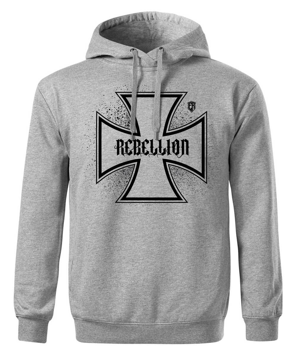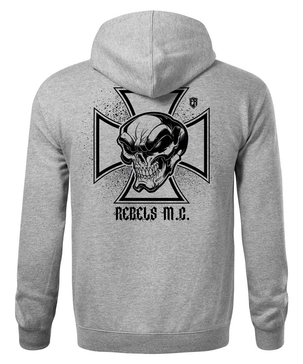 Pánská mikina Iron Cross (Šedá-Černá). Speciální mikina v rebelském stylu. Ve předu je železný kříž s nápisem REBELLION a na zádech je železný kříž s lebkou a nápisem REBELS M.C. Šetříme přírodu, neskladujeme, vyrábíme ihned po objednání, do 14 dnů. Kolekce MOTO. Česká značka Elitní Rebel.
