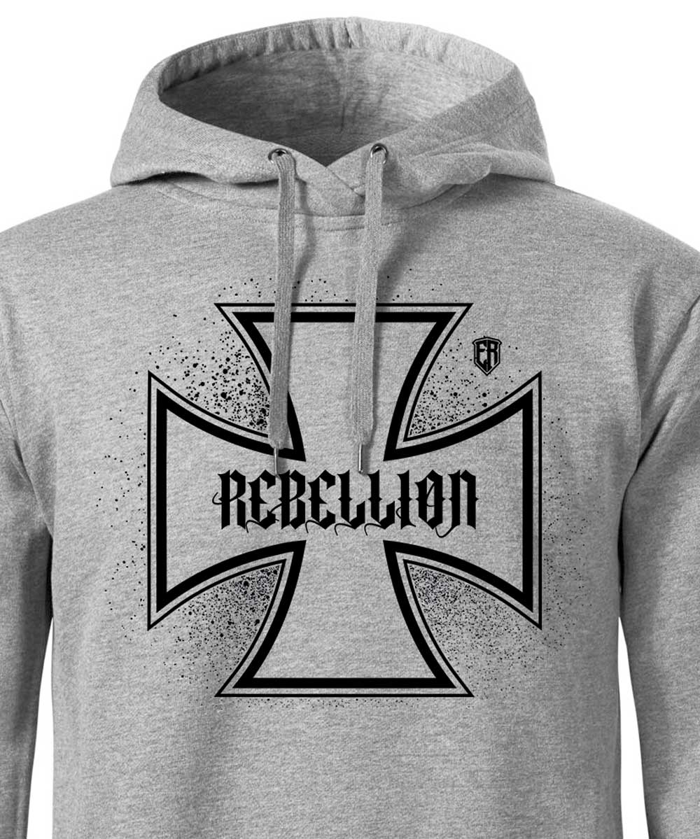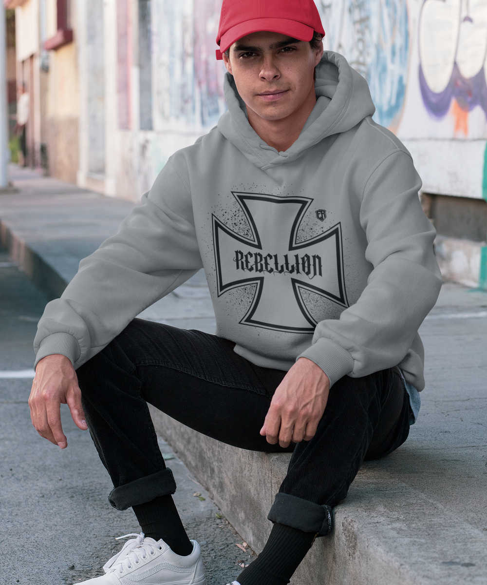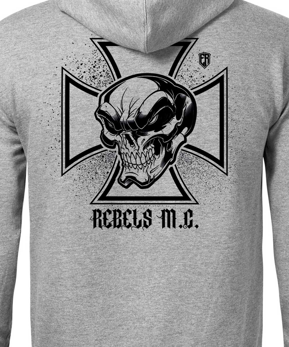 Pánská mikina Iron Cross (Šedá-Černá). Speciální mikina v rebelském stylu. Ve předu je železný kříž s nápisem REBELLION a na zádech je železný kříž s lebkou a nápisem REBELS M.C. Šetříme přírodu, neskladujeme, vyrábíme ihned po objednání, do 14 dnů. Kolekce MOTO. Česká značka Elitní Rebel.
